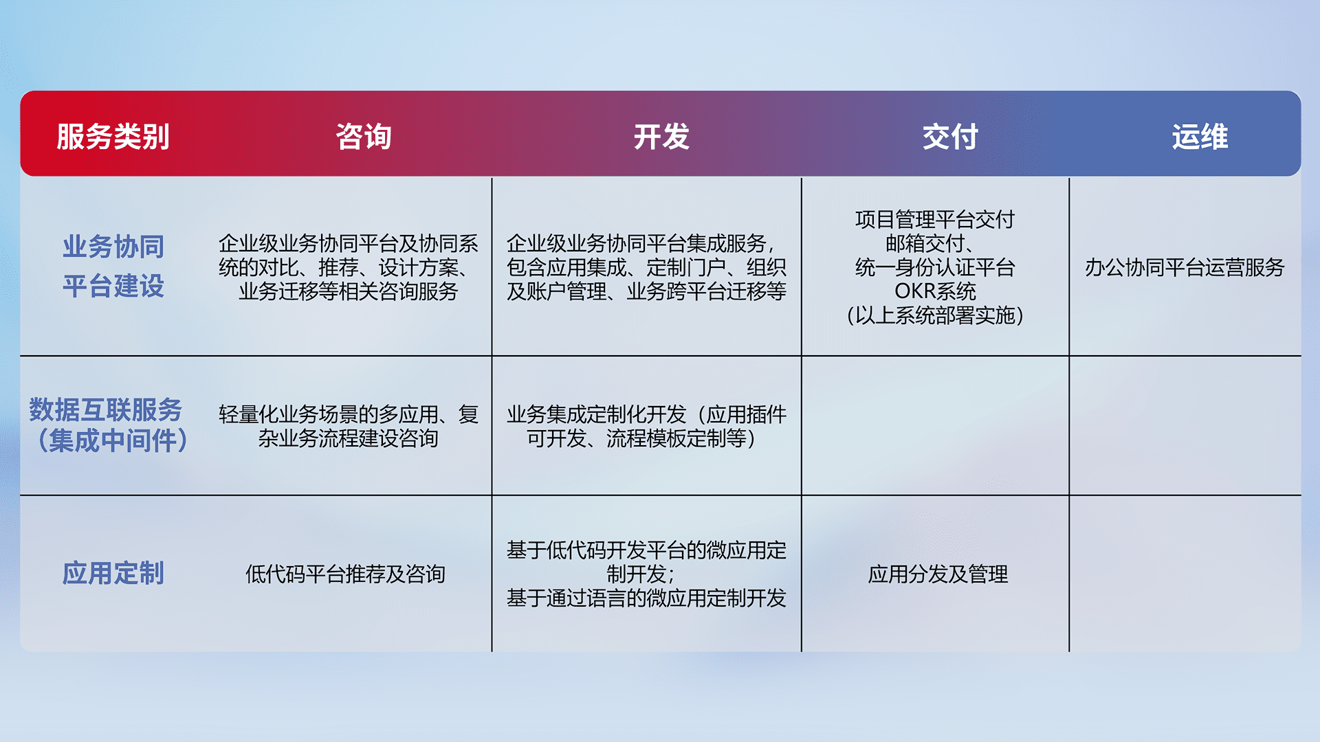 针对钉钉、、、、企微、、、、IDaas等平台级产品提供产品的规划、、、方案、、交付、、、、定制化开发等服务,,,实现如统一协同办公、、、智能客户服务、、混合会议管理、、、、智能数据查询、、、等业务场景,,实现数字化转型。。